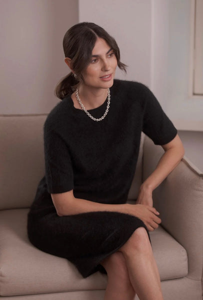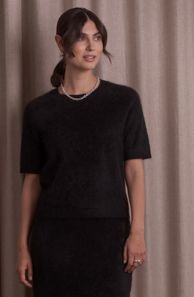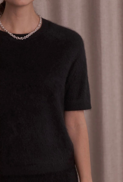 Lyhythihaisessa kashmirneuleessa on O-pääntie, raglanhihat ja suora malli. Pehmeä, harjattu kashmir tuntuu ylelliseltä iholla.