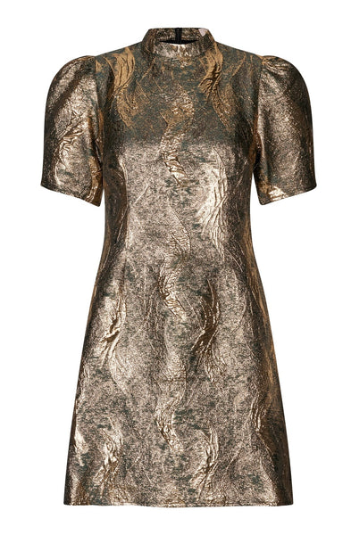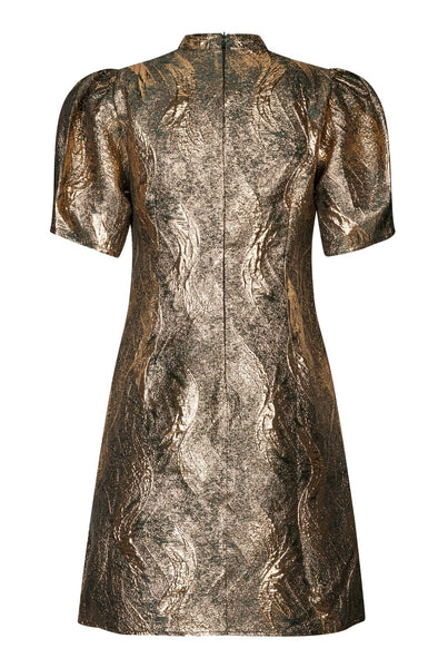 Upea, jaquard-kuvioitu mekko, jossa kulta ja vihreä muodostavat näyttävän parin. Pieni pussihiha ja pitkä vetoketju takana. Mekko on melko pientä yläosastaan, joten suosittelemme valitsemaan yhtä kokoa isomman kuin muuten käyttäisit.