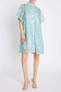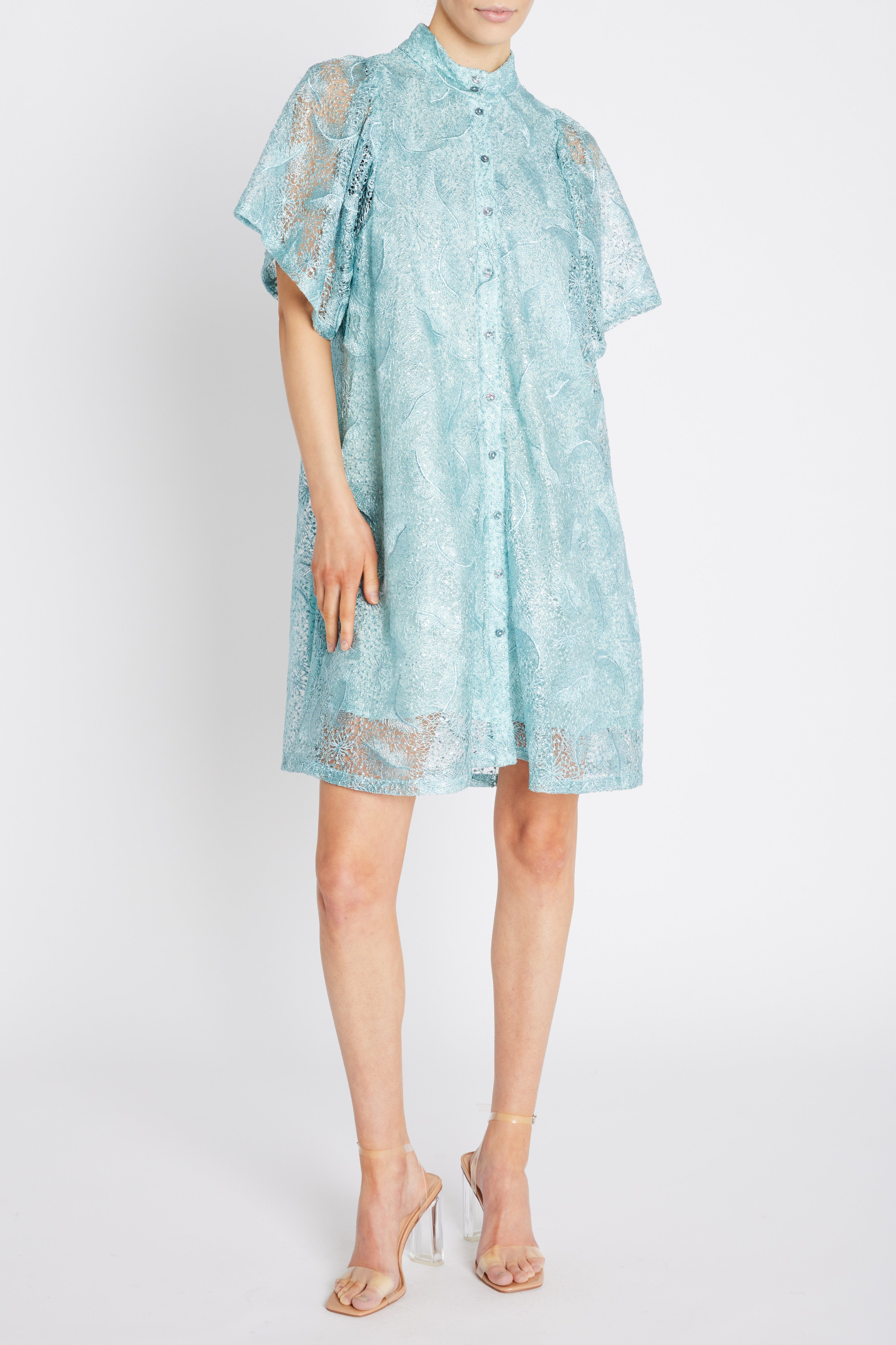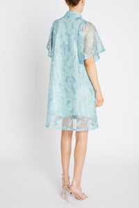 Upea veden vihreä väljä ja lyhyt mekko, jossa on kiva pystykaulus ja pienet pussihihat. Monikäyttöinen mekko, jonka voit asusteita vaihtamalla pukea arkeen tai juhlaan. Kiinteä vuori on mielyttävää viskoosia.