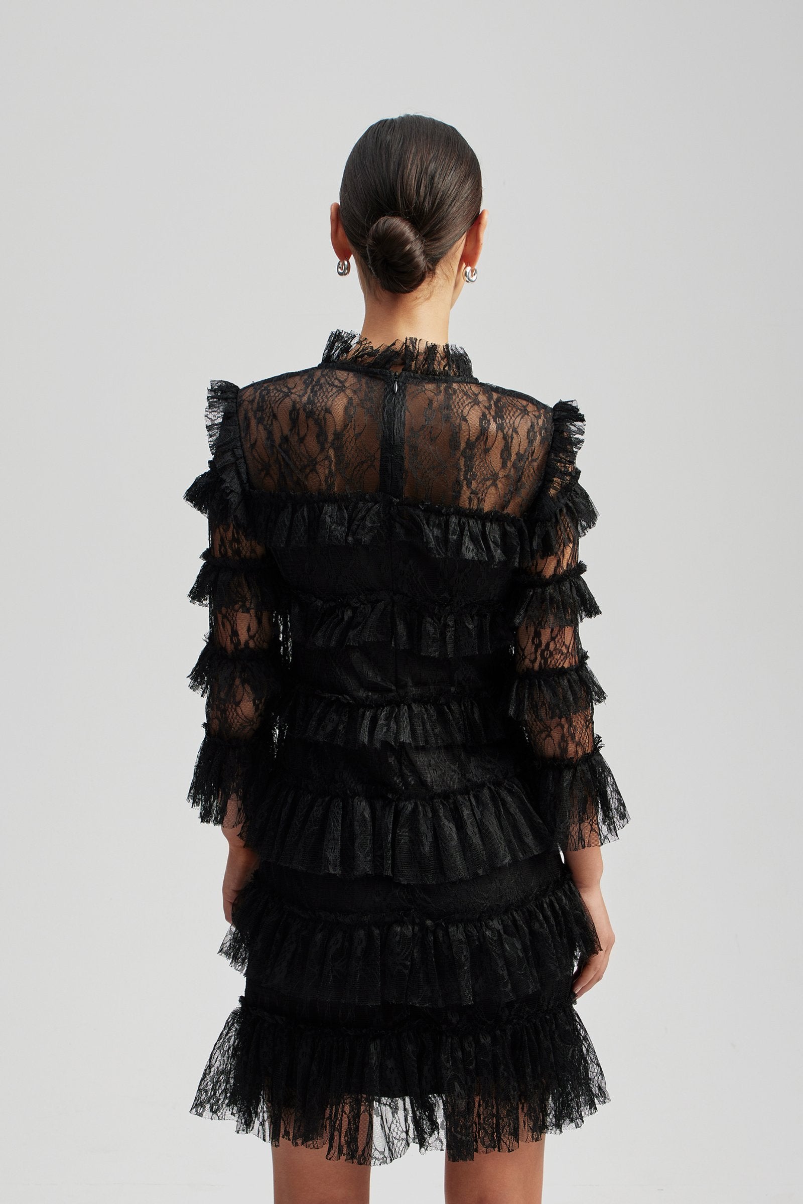 Ihanasti pitsiä ja kerroksia, mekosta ei kuulla läpi. Pehmeä miellyttävä materiaali.