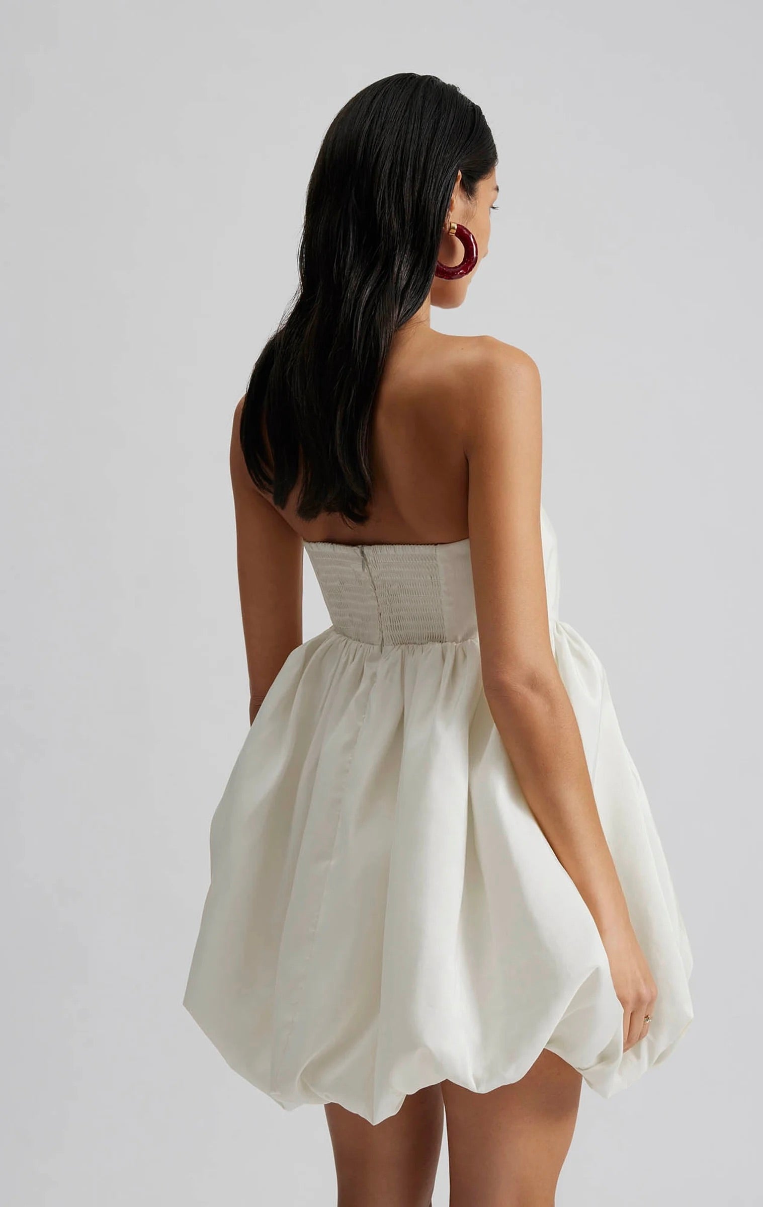 Luunvalkoinen, lyhyt olkaimeton pallomekko. Smokkirypytys takaosassa, joka joustaa vartalon mukaan. Piilovetoketju takana, joten mekon voi pukea alakautta.