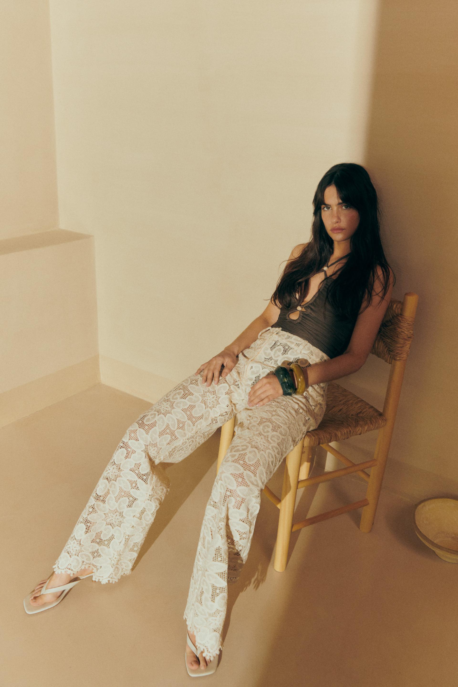 Guipure-pitsiset suoralahkeiset housut, jotka keräävät katseet. Hiukan korkeampi vyötärö ja vyönlenkit. Upeasti leikattu pitsireunus lahkeissa. Vuoriton.