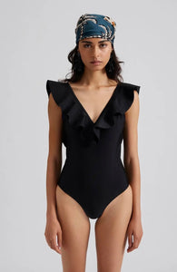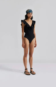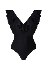 Kaunis ja ajaton kokouimapuku, jonka sekä etu- että takaosassa v-leikkaus ja röyhelöreunus. Toppaukset, jotka voi myös poistaa helposti.