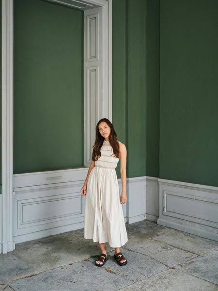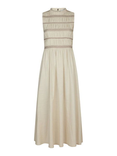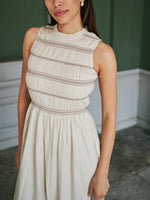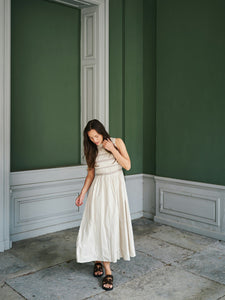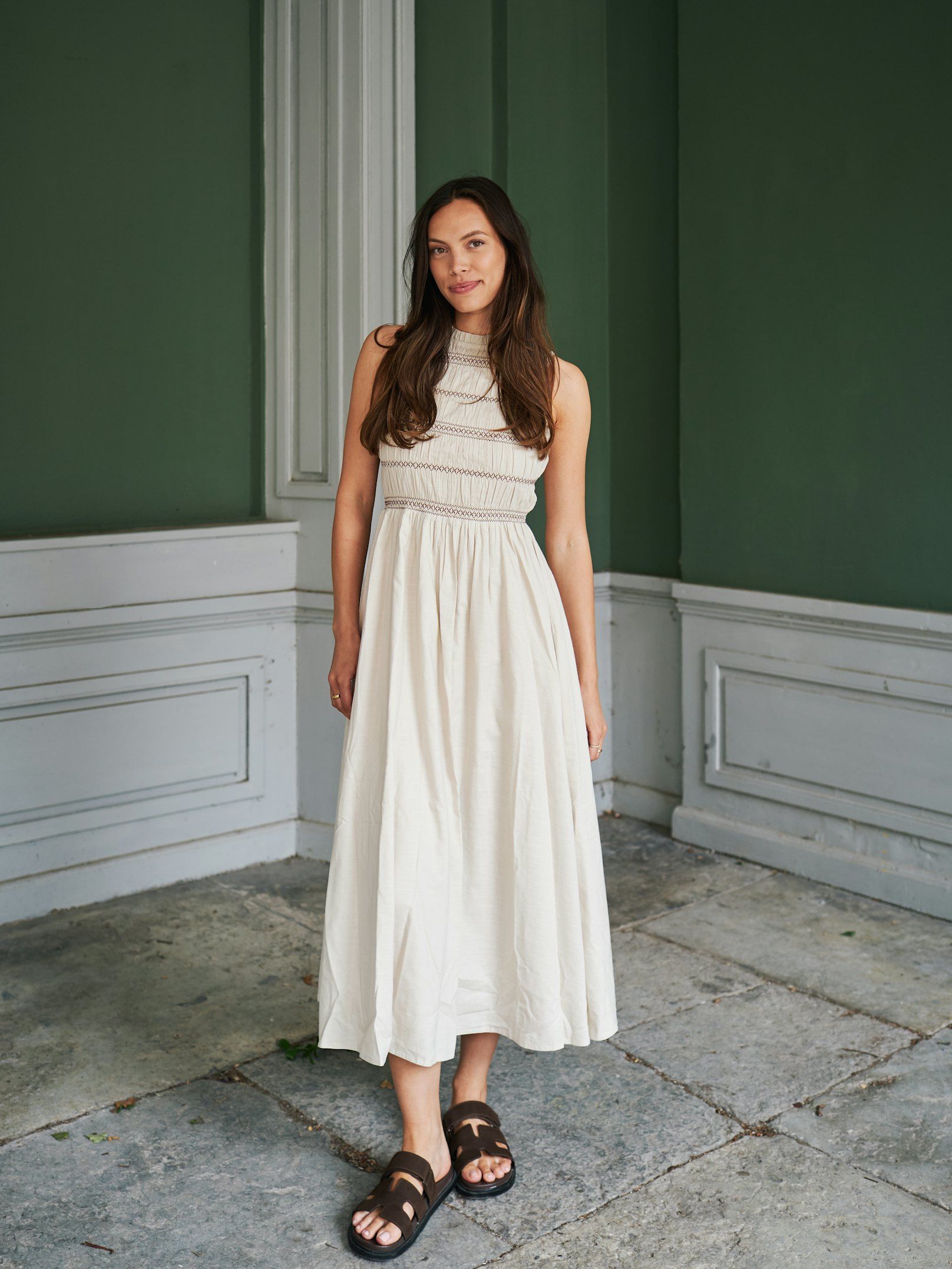 Hyvin kaunis ja monikäyttöinen mekko. Hihaton malli, jossa kiva rypytetty yläosa, takana vetoketjukiinnitys. Ihanaa 100% puuvillaa.