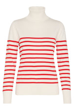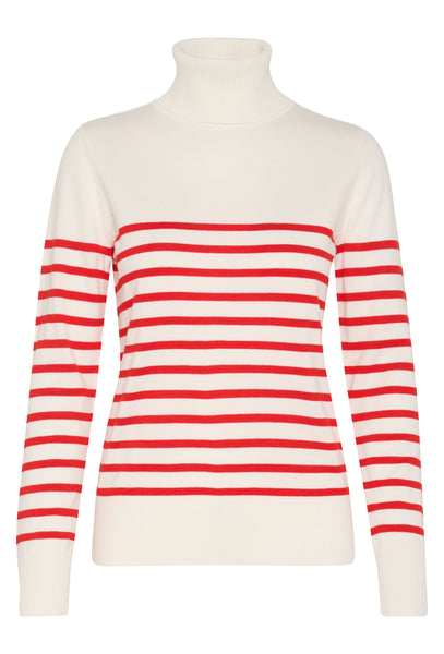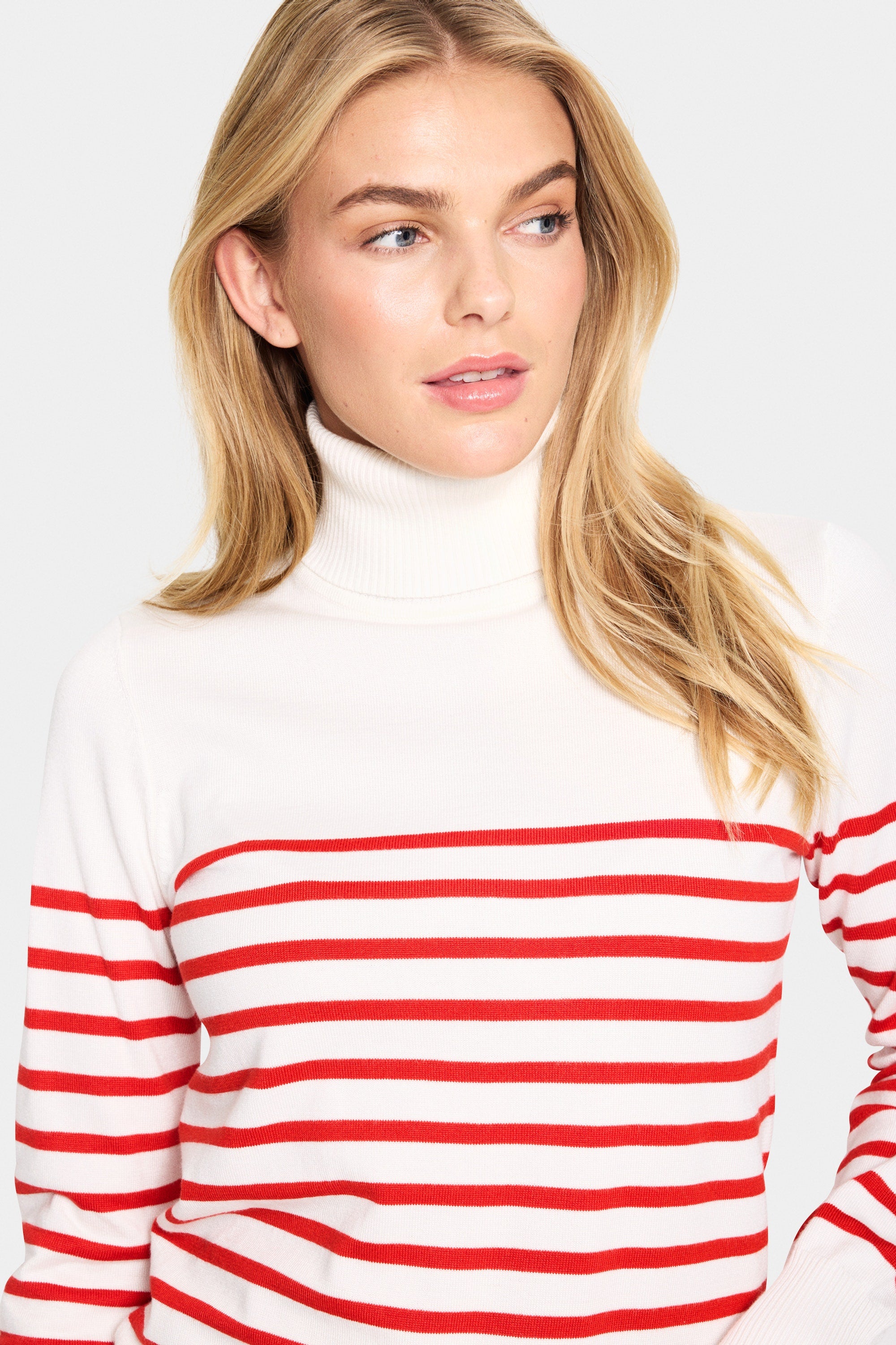Saint Tropez raikas pooloneule punaisella raidalla. Malli kuvassa on 177cm pitkä ja käyttää kokoa M.